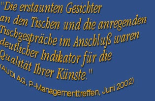 Ziele zu erreichen. Sie möchten wissen, für wen ich schon gearbeitet habe? Dann klicken Sie hier für einen Überblick über meine zufriedenen Kunden. Und wenn Sie mich einmal live erleben möchten, dann finden Sie hier einen Überblick über meine nächsten Termine. Oder Sie vereinbaren gleich mal einen ersten, unverbindlichen Gesprächstermin – ich stelle Ihnen gerne weitere Ideen für Ihr erfolgreiches Event vor. Ich bin Mitglied