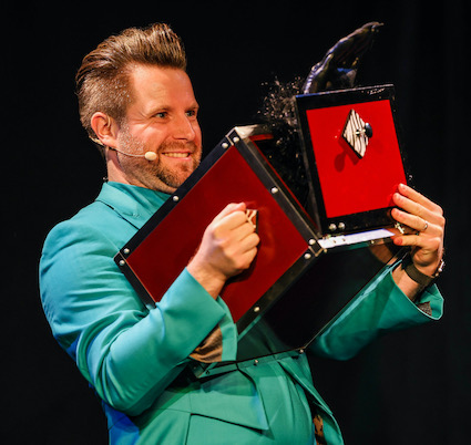 Magier zusammen mit dem Publikum die Welt auf den Kopf